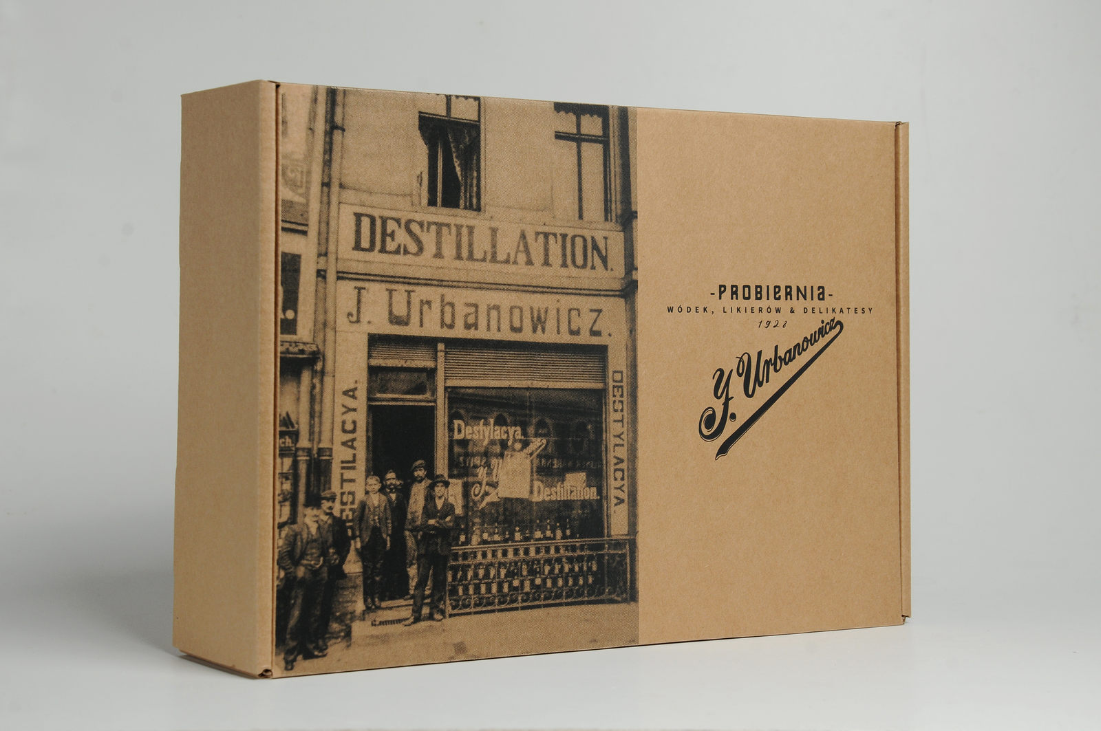 Kartonowe opakowanie z logo J. Urbanowicz dodaje całości prestiżu i gotowości do wręczenia.