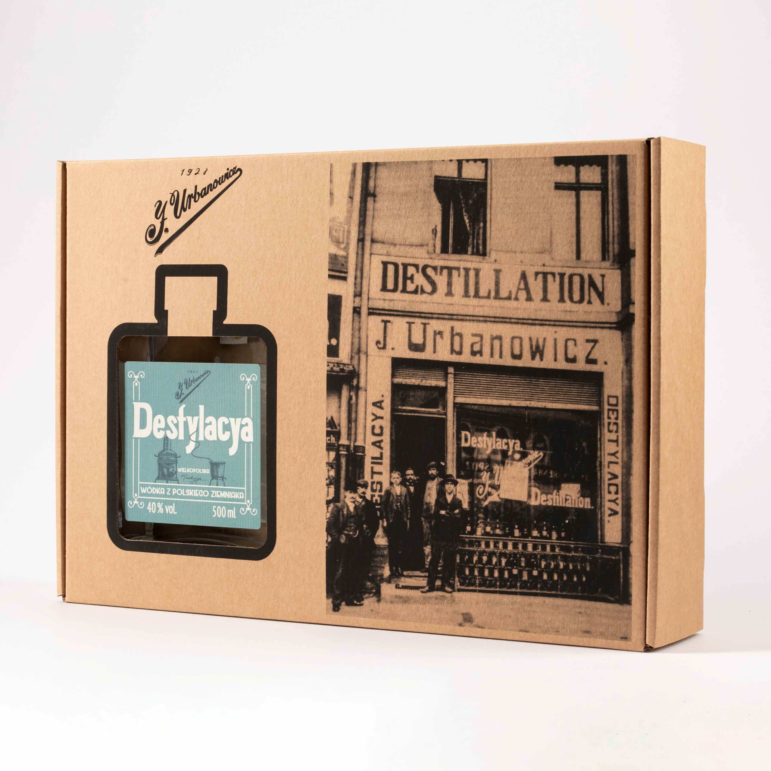 J. Urbanowicz Zestaw Prezentowy – Wódka Ziemniaczana „Destylacya” 0,5 L + Dwa Kieliszki Firmowe